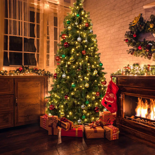 7.5ft Pre-lit Christmas Tree, Spruce Artificial Christmas Tree with Warm White Lights, Xmas Tree with Storage Bag and Metal Stand for Indoor and Outdoor Holiday Decoration